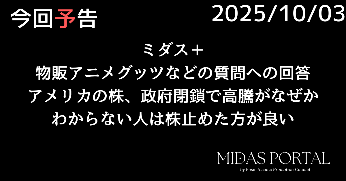 ショッピングリンク Yahoo!ショッピング 楽天市場 メルカリ ミダス+物販アニメグッツなどの質問への回答 アメリカの株、政府閉鎖で高騰がなぜかわからない人は株止めた方が良い 「全世界 “ガンダム” 総選挙 2025」来たる 「全世界 “ガンダム” 総選挙 2025」来たる 立憲共産党の力の見せどきだ。やってみる価値はありますぜ! 総選挙はこちら(ガンダムオフィシャルへ) ミダス+ 2025.10.16 ▶︎この動画を見てみる 公開日:2025/10/01